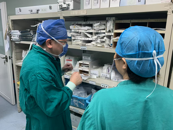 孫藝鵠(左一)在某醫院耗材庫房核實醫療耗材使用情況