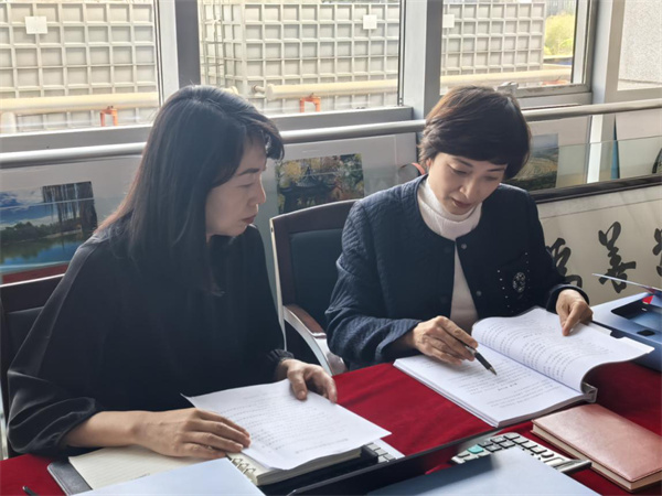 余琴(右)和同事在審計現場核查居家適老化改造項目檔案資料