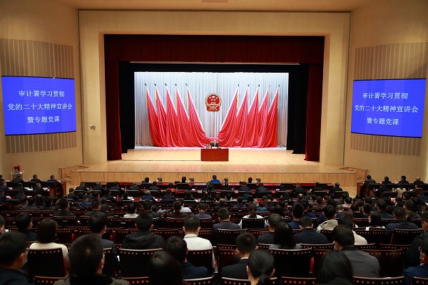 11月14日下午,審計署召開學習貫徹黨的二十大精神宣講會,審計署黨組書記、審計長侯凱以“在習近平新時代中國特色社會主義思想指引下,奮力開創審計工作高質量發展新局面”為題,為全署黨員干部講黨課,宣講黨的二十大精神。在京署領導出席宣講會。