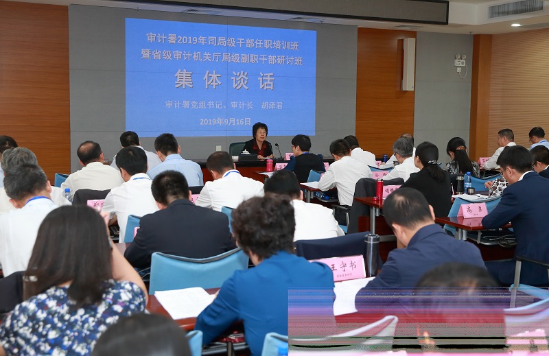9月16日,審計署在京舉辦2019年度司局級干部任職培訓班暨省級審計機關廳局級副職干部研討班。審計署黨組書記、審計長胡澤君與參訓學員集體談話。署黨組成員、副審計長孫寶厚為學員授課。審計署2019年新任職副司局級干部進行了憲法宣誓。