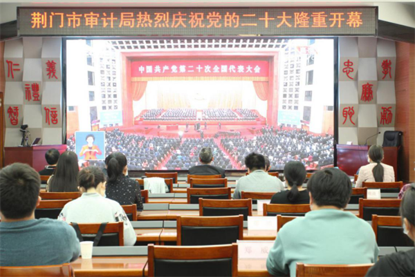 荊門市審計局組織60多名在職審計干部在會議室集中收聽收看二十大開幕盛況;組織30多名離退休老干部通過電視、互聯網、移動設備等載體同步觀看開幕直播。