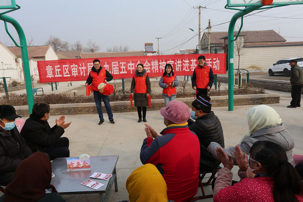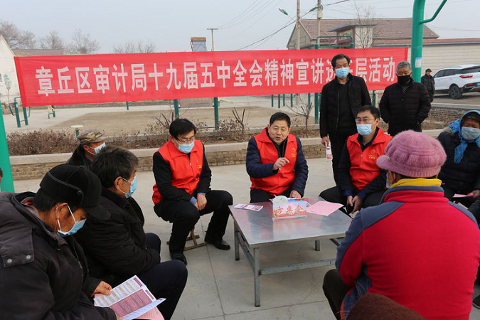“父老鄉親大家好,感謝你們來捧場,表演一段三句半,請鼓掌。要問俺是哪里的,章丘審計局里的,這回來了不審計,說兩句。五中全會開得好,‘十四五’來謀高招,二〇三五定目標,步步高……”在青野村的小廣場上,章丘區審計局4名審計干部正在用自編自演的“三句半”宣傳十九屆五中全會精神。鑼鼓聲中,生動詼諧的說唱、認真質樸的表演,吸引了不少村民前來觀看。