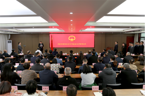 四川省審計廳組織今年新提任的16名處級領導干部參加憲法宣誓儀式。在儀式上,16名同志整齊列隊,面向國徽,全體肅立,奏唱中華人民共和國國歌。領誓人左手撫按《中華人民共和國憲法》,右手舉拳,領誦誓詞,其他宣誓人高舉右拳,跟誦誓詞。錚錚誓言,耿耿忠心。莊嚴的宣誓聲回蕩在儀式現場,裊裊余音飽含著審計人捍衛憲法權威的堅定決心,句句深情表達著審計人履行職責使命的忠誠擔當。